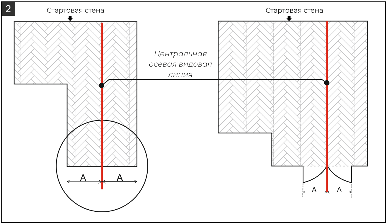 8.1. Выберите стену, от которой вы начнете монтаж. Перед укладкой проведите измерения помещений и разметочные работы: отметьте . Чаще всего линию отмечают по центру длинного коридора или по центру дверного проема (рис. 2).