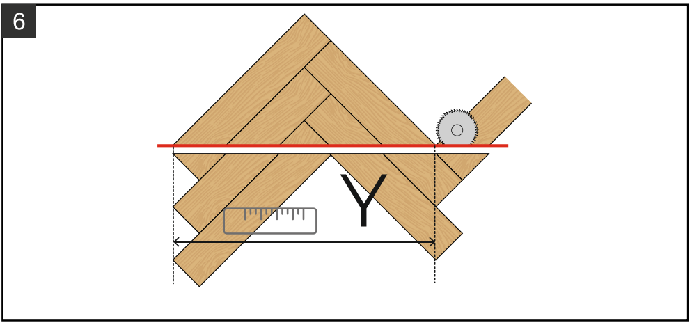 9.4. Распилите треугольник по указанной красной линии (рис. 6). В зависимости от типа пилы, которую вы используете, разберите плашки и отпилите каждую по отдельности или сделайте это уже в сборке, предварительно наметив линию при помощи угольника и карандаша.