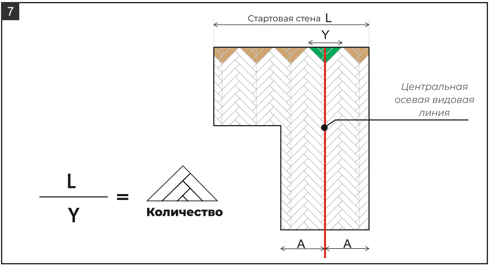 Разделите длину стартовой стены помещения на длину основания треугольника (Y). Сделайте столько треугольников, какое значение у вас получилось.