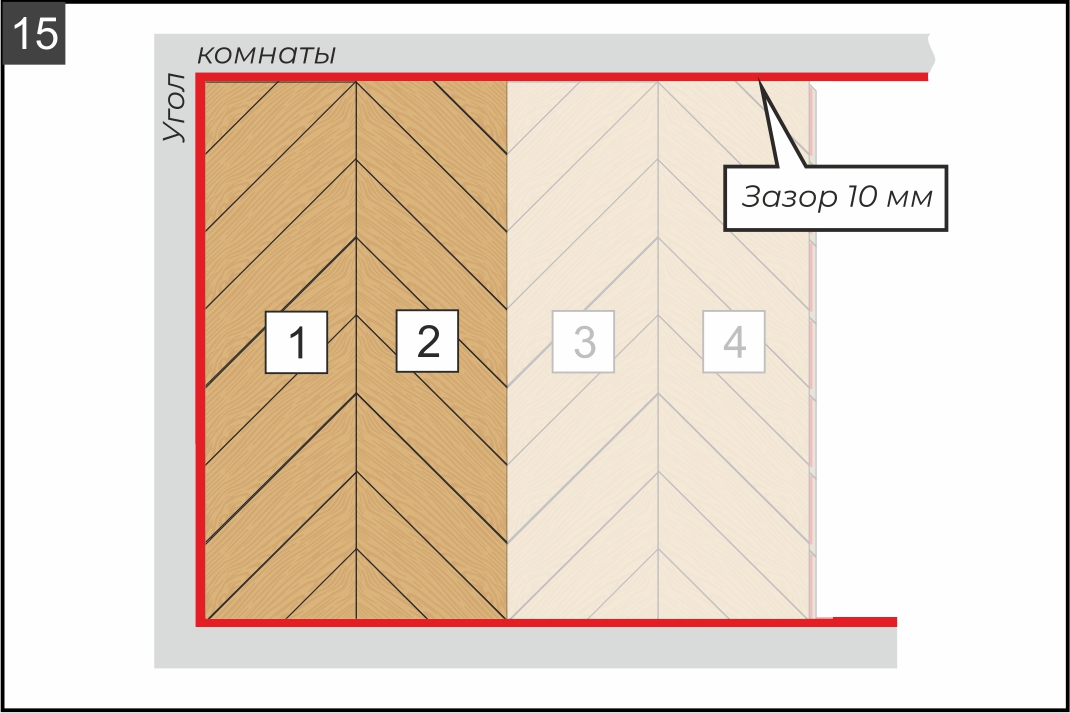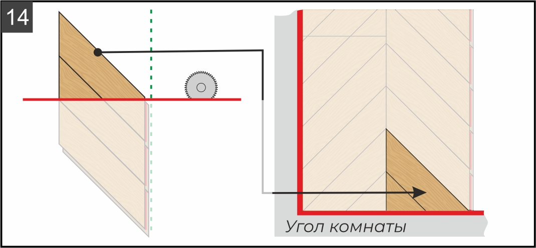 9.2. Отрежьте край ряда по указанной на рисунке красной линии (она формируется в зависимости от левого угла комнаты). Исходя из расчетов (см. рисунок 5) при необходимости подрежьте плашки по длине. В зависимости от типа пилы, которую вы используете, разберите плашки и отпилите каждую по отдельности или сделайте это уже в сборке, предварительно наметив линию при помощи угольника и карандаша.